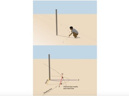 По словам Дэша, этот несложный метод можно сделать еще проще, если проводить наблюдения в день осеннего равноденствия. В этот день линия, проведенная через точки тени гномона, практически повторяет прямую, проведенную с запада на восток.