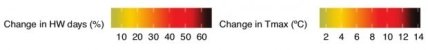Карты разницы в количестве аномально жарких дней (слева) и максимальной температуры (справа) в европейских городах между рассчитанными для периода 2051-2100 годов и историческим периодом 1951-2000 годов