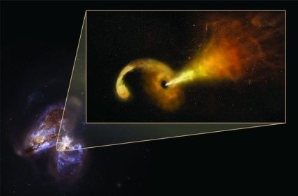 Астрономы заметили яркий взрыв около Arp 299 и следили за изменениями в течение десятилетия. Наблюдения показали, что струя электромагнитных волн идет в одном направлении от черной дыры.