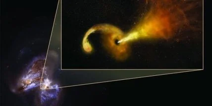 Астрономы заметили яркий взрыв около Arp 299 и следили за изменениями в течение десятилетия. Наблюдения показали, что струя электромагнитных волн идет в одном направлении от черной дыры.