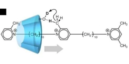 Еще одним элементом молекулярной машины является альфа-циклодекстрин, циклическая структура, состоящая из шести колец глюкозы. Эта часть достаточно велика, а ее форма достаточно хорошо соответствует концу молекулы с "трещоткой". А с химической точки зрения эта структура является катализатором процесса обмена водородными атомами с водным раствором. Проведенные исследования показали, что водородный обмен происходит только на одном конце трещотки. На это указало то, что ионы дейтерия были найдены на двух метильных группах только одной стороны и в центральной части молекулы, когда она, эта молекула, была помещена в тяжелую воду (D2O).
