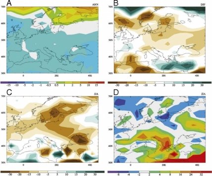 (A) Годовое изменение климата, (B) изменения осадков зимой и (C) летом, (D) значение осадков δ<sup>18</sup>O в тысячных долях