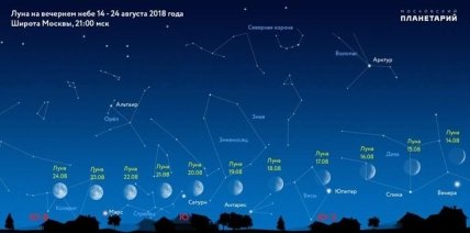 21 августа наш спутник будет находиться в 2 градусах севернее Сатурна. 23 августа - в 7 градусах севернее Марса. 27 августа - в 2 градусах южнее Нептуна. 31 августа - в 5 градусах от Урана.