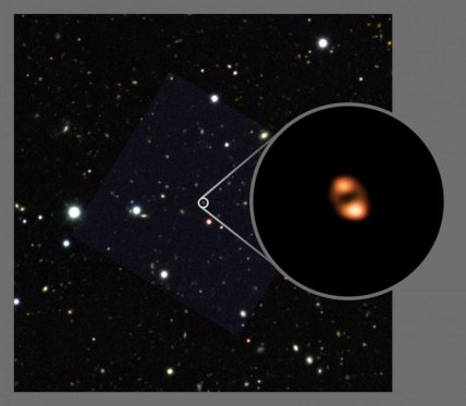 В статье, опубликованной в журнале Science, Джастин Спилкер (Justin Spilker) и его коллеги сообщают о наблюдениях галактики SPT2319-55, проведенных с помощью радиотелескопов ALMA. Работе помог и случай: между нами и SPT2319-55 находится другая массивная галактика, притяжение которой искривляет траекторию лучей, идущих к нам от нее, действуя как гравитационная линза. Поэтому SPT2319-55 можно наблюдать в искаженном и заметно увеличенном виде. Специальные алгоритмы позволяют восстановить ее исходный облик.