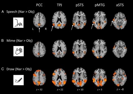 Путем "вычитания" одних реакций из других ученые выяснили, что в составлении и рассказе историй, вне зависимости от способа повествования, важнейшую роль играют три области: височно-теменной узел (TPJ), верхняя височная борозда (STS) и задняя поясная кора (PCC). Первая отвечает за сбор информации из таламуса, лимбической, зрительной, слуховой и соматосенсорной систем и обрабатывает ее. Вторая анализирует речь, распознает лица и участвует в социальном восприятии. Функции третьей связаны с обучением и памятью. Этот кластер они назвали "повествовательным центром".
