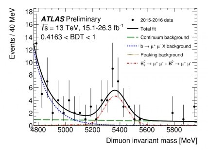 Согласно Стандартной модели, вероятность получения этого распада — примерно 1,1 к 10 миллиардам. Новый результат ATLAS подошел очень близко — с максимально возможным верхним пределом в 2,1 случая из десяти миллиардов при 95%-ной достоверности. Результат получили с использованием данных за 2015-2016 годы и аналогичного анализа данных сеанса Run 1. Этот результат также предоставил 4,6 стандартной девиации для распада Bs-мезона в пару μμ (Bs→ μμ), чья доля ветвления измеряется как 2,8 +0,8–0,7 x10–9. Это подтверждает предыдущие вычисления, полученные коллаборациями LHCb и CMS.