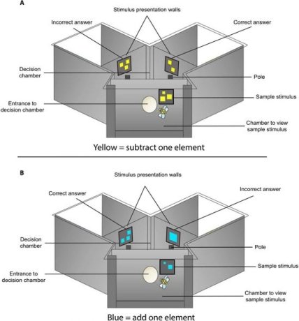 После того как связь "синий — увеличение", "желтый — уменьшение" была зафиксирована, ученые показали, что пчелы действительно "осознают" обе математические операции. Так, если в развилке Y-образного лабиринта демонстрировались синие фигуры, то они летели в сторону экрана, на котором их было на одну больше, а если желтые — к экрану с меньшим количеством фигур. Верный выбор они делали в 63-72 попытках из 100, в зависимости от особи. "Понимали" пчелы и равенство числа фигур: такой вариант в экспериментах считался неправильным.