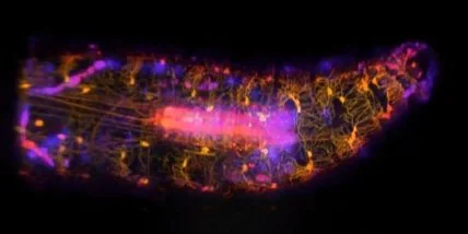 Биологи из Колумбийского университета (США) воспользовались микроскопом SCAPE (Swept Confocally Aligned Planar Excitation Microscopy), чтобы заснять работу нервных клеток личинки дрозофилы in vivo во время движения. Результаты опубликованы в журнале Current Biology.