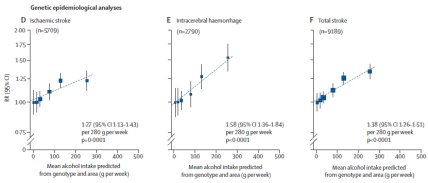 График соотношения количества потребляемого алкоголя и вероятности ишемического инсульта (D), геморрагического инсульта (E) и инсульта вообще (F) согласно данным генно-эпидемиологического анализа