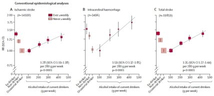 Исходя из полученных данных, авторы приходят к выводу, что алкоголь повышает риск инсульта примерно на треть (35%) на каждые четыре дополнительных напитка в день (280 граммов алкоголя в неделю), не демонстрируя никаких защитных эффектов от умеренного употребления алкоголя.