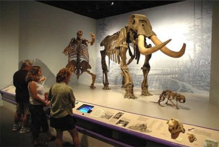 Скелеты представителей мегафауны Северной Америки, обитавших на территории нынешнего штата Иллинойс и вымерших в позднем плейстоцене (0,126-0,0117 миллиона лет назад). Витрина выставки в Музее штата Иллинойс. Слева направо: гигантский наземный ленивец, мастодонт, гигантский бобр