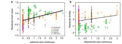 Однако исследователи из Швейцарии предлагают другую гипотезу, согласно которой размер мозга потомства млекопитающих зависит от того, кто занимался его воспитанием. Они проследили за 478 млекопитающими, относящимися к хищным, грызунам, приматам и другим отрядам. Они заметили корреляцию между участием отца и размером мозга. Чем дольше тот участвовал в воспитании, тем больше оказывалась масса мозга детенышей. Такую же корреляцию они увидели между аллородительским (alloparental) поведением (когда за потомством ухаживает непрямой прародитель) и фертильностью (числом детей), но она сохранялась только у тех видов, у которых обязанности воспитания разделяли самцы.