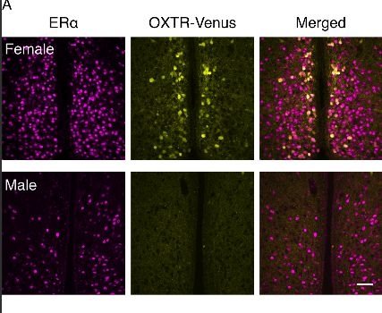 Клетки - рецепторы окситоцина (OXTR-Venus), как видно, в большом количестве содержатся в мозге самок (верхний ряд), при этом у самцов они отсутствуют (нижний ряд)
