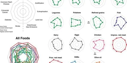 За очень немногими исключениями их результаты показывают, что полезные продукты питания, такие как фрукты, овощи, орехи, бобовые и зерновые, оказывают меньшее воздействие на окружающую среду с точки зрения сельского хозяйства и массового производства продуктов питания.