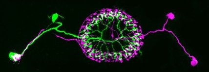 Здесь показаны три разных цвета - три нейрона, которые обеспечивают визуальные сигналы для компаса в мозге мухи.