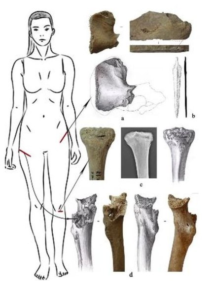 Кроме того, в левом колене исследователи обнаружили железный наконечник стрелы, которые использовались в войне и для охоты. Ученые изучили еще три повреждения скелета (судя по всему, эти раны и повлекли смерть девушки): на бедрах обнаружились следы от меча, а часть левой ноги и вовсе была отрублена топором. Следовательно, отмечают археологи, увечья были нанесены не одним человеком, а несколькими и на поле боя.