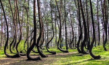 Находится это место в Польше. Небольшая роща, насчитывающая несколько сотен сосен, была посажена более 80 лет назад. Все деревья в ней имеют причудливые формы. Некоторые говорят, что это результат какого-то неизведанного природного явления, другие же пеняют на человеческий след (что вполне возможно). Но вот зачем кому-то "искривлять" специально лес, затрачивая на это десятки часов жизни каждый месяц, непонятно.
