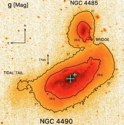 Прежде одно ядро NGC 4490 наблюдали оптическими, а другое - инфракрасными и радиотелескопами. Они примерно одинаковы по размерам, массе и яркости, так что астрономы попросту не замечали, что имеют дело с двумя разными объектами. Увидеть и опознать оба одновременно удалось лишь теперь. Статья Аллена Лоуренса (Allen Lawrence) и его коллег из Университета штата Айова принята к публикации в The Astrophysical Journal и пока представлена в открытой онлайн-библиотеке препринтов arXiv.оrg.