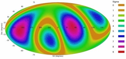 Асимметрии в распределении направлений вращения спиральных галактик образуют "космологический квадруполь". Цвет на изображении соответствует величине стандартного отклонения: чем она выше - тем выраженнее различия