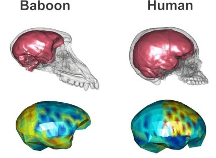 Тепловые карты показывают, что мозг человека характерно выпуклый в префронтальной коре, а у бабуинов наоборот, изменения происходят во временной и затылочной областях.