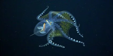 На видео попал редкий вид прозрачного осьминога, который живет на глубине от 200 метров до километра.