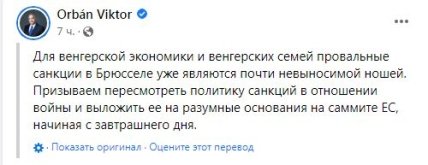 "Для венгерской экономики и венгерских семей провальные санкции Брюсселя уже являются почти невыносимой ношей", — написал Орбан.