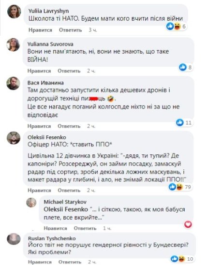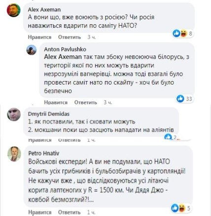 Реакция украинцев на эту информацию оказалась противоречивой, одни отметили, что в НАТО недооценивают угрозу, а другие добавили, что Альянс не находится в состоянии войны.