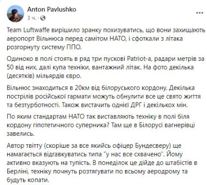 Павлушко также указал на то, что автор твитта еще и пытается отшучиваться на критику, но выразил убеждение, что вскоре эта информация дойдет до штабистов и технику растянут и окопают по всему аэродрому.