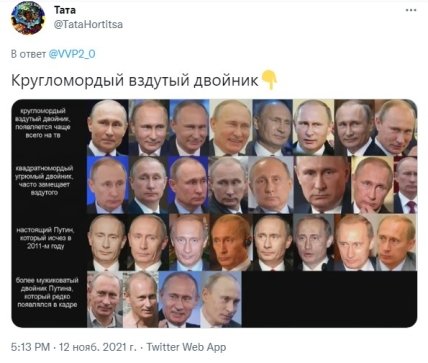 В соцсетях на некую разность между чертами лица российского президента также обратили внимание. Они даже составили классификацию вероятных двойников Владимира Путина.