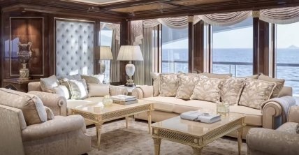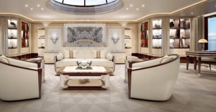 Также имеется бильярдная комната, стол в которой благодаря специальному механизму не наклоняется при качке. Из особенностей — наличие сразу трех каминов, причем один из них работает на дровах, что редкость даже для такого класса элитных яхт.