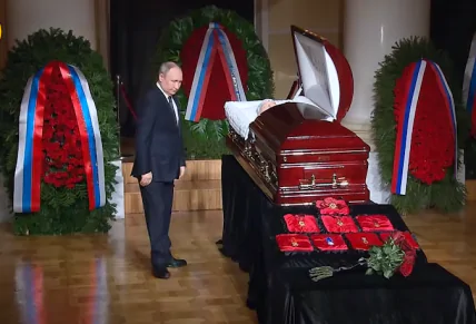 Путин возложил к гробу Жириновского букет красных роз. Затем положил на гроб руку, перекрестился, поклонился и ушел