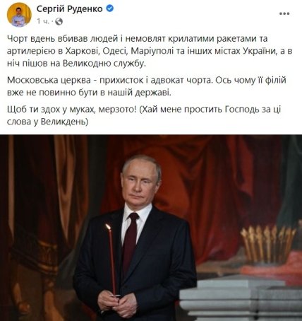 "Черт днем убивал людей и младенцев крылатыми ракетами и артиллерией в Харькове, Одессе, Мариуполе и других городах Украины, а ночью пошел на Пасхальную службу".
