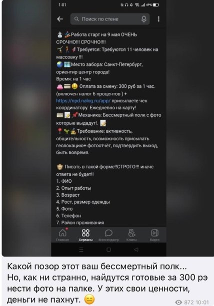 В рф начинают искать массовку за оплату на шествие "Бессмертный полк", которое планируется на 9 мая. Такие объявления для петербуржцев распространяют на российских Телеграм-каналах и в социальных сетях.