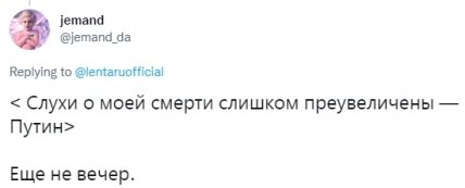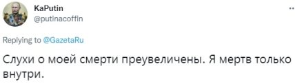 Тем временем, в Twitter началась волна реакций на сказанное путиным. Многие пользователи связывают цитату не с контекстом санкций, о котором говорил российский президент, а о его делах со здоровьем.