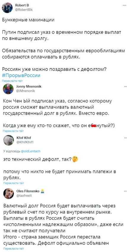В сети после этого началось бурное обсуждение, в частности пользователи сети задались вопросом, будет ли это считаться техническим дефолтом и будут ли эти платежи приняты.