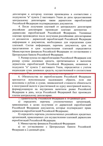 Как сообщают росСМИ, временный порядок выплат по внешнему валютному долгу предусматривает, что россия будет считать оплату рублями по еврооблигациям "надлежащим исполнением обязательств".