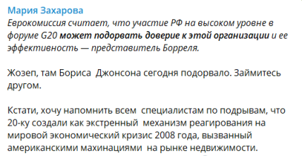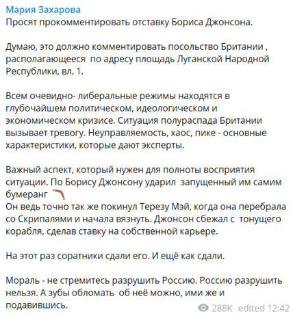 Представительница российского МИД мария захарова не удержалась и опубликовала два сообщения об отставке Джонсона. И они уже были с ее традиционным откровенным хамством. В первом она заявила о "всем очевидном" глубоком кризисе либеральных режимов – политическом, идеологическом и экономическом, а ситуацию в Британии назвала "полураспадом" и пригрозила Западу обломанными о россию зубами. Кроме того, она призвала главного дипломата Евросоюза Жозепа Борреля заняться "подорванным другом", а не отстранением россии от предстоящего саммита G20.