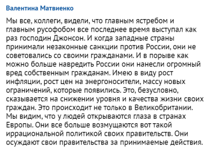Спикер Совета федерации валентина матвиенко почему-то связала отставку Джонсона с санкциями против россии, которые ввела Великобритания. Хотя на самом деле ее спровоцировал скандал с сексуальными домагательствами, которые позволял себе один из назначенных премьером чиновников от Консервативной партии. А до этого – вечеринки правительства во время локдауна.