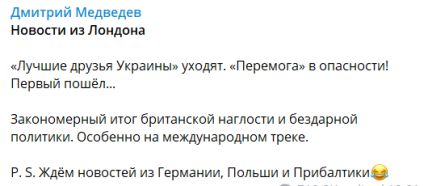 Карманный ястреб путина дмитрий медведев был не таким красноречивым, как в последнее время, и не хамил откровенно. Зато как продвинутый пользователь соцсетей оставил в своем посте смайлик. Отставку Джонсона он назвал "закономерным итогом наглости и бездарной политики".