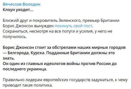 В этом "обвинил" Джонсона спикер Госдумы вячеслав володин. Он назвал британского чиновника клоуном, а также близким другом и покровителем президента Украины Владимира Зеленского (второе в целом правда) и порадовался тому, что, несмотря на все усилия, удержаться на посту Джонсону не удалось. "Он один из главных идеологов войны против россии до последнего украинца", — написал володин в телеграмме и призвал лидеров европейских государств "задуматься".