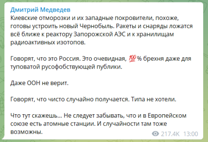 Прежде всего, он выразил недовольство тем, что никто на Западе не верит в ложь кремля, что Украина обстреливает собственную атомную электростанцию – захваченную россиянами Запорожскую АЭС. А потом заявил, что, если не поверят, то "вторая армия мира" может нанести удары по европейским ядерным объектам. "Не следует забывать, что и в Европейском союзе есть атомные станции. И случайности там тоже возможны", — написал медведев.