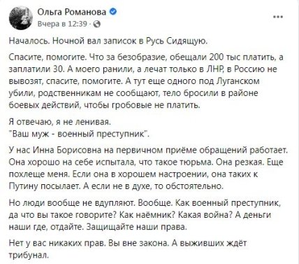 "Но люди вообще не вдупляют. Вообще. Как военный преступник, да что вы такое говорите? Как наёмник? Какая война? А деньги наши где, отдайте. Защищайте наши права", — написала она.