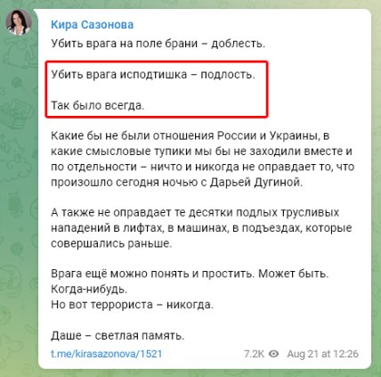 Жалобный пост также написала политолог-пропагандистка Кира Сазонова, которая высказала мнение, что убивать врага исподтишка является подлостью. Впрочем, о попытке отравления экс-шпиона Сергея Скрипаля в Британии и оппозиционера Алексея Навального в россии, а также убийстве Бориса Немцова, она почему-то упоминать не стала.