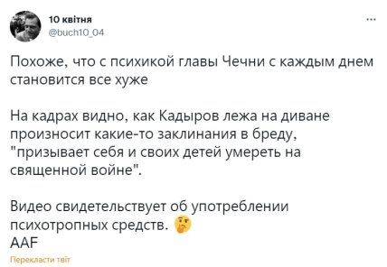 Видео с обращением кадыров опубликовал в своем Telegram-канале. По его словам, на фронте в чеченских подразделениях все хорошо и каждый день они убивают "более 600 бандеровцев". Однако ему очень жаль украинский народ, ставший "заложником натовской политики".
