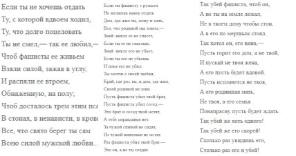 Строки поэта и призыв убивать были направлены против оккупантов, пришедших во время Второй мировой на территорию СССР: "Если ты не хочешь, чтоб пол/ В твоем доме фашист топтал, / Чтоб он сел за дедовский стол / И деревья в саду сломал…". Стих Симонова стал воодушевлением для солдат для борьбы с врагом пришедшим на их землю. Но кибовский сознательно опускает тот факт, что это россия вторглась на территорию Украины, убивая жителей, разрушая дома и города.
