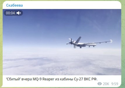 Тем временем большинство россиян уже "празднуют" сбитие американского дрона. Интересно, что одна из главных пропагандисток кремля — ольга скабеева — уже опубликовала это видео в своем Telegram-канале, утверждая, что это именно тот MQ-9.