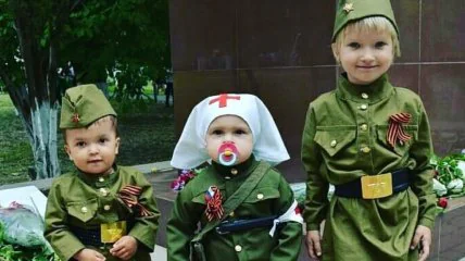 Также в видеонарезку попали ролики, на которых маленькая девочка машет флагом СССР или ученики младших классов браво маршируют на фоне флага россии, в который выстроились взрослые, и чеканят слова песни про войну. На другом отрывке мальчик лет 10 в военной форме на фоне фото убых оккупантов читает строки "Клянусь своей русской кровью — не дрогнет моя рука, если придется закрою телом путь для врага".
