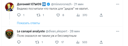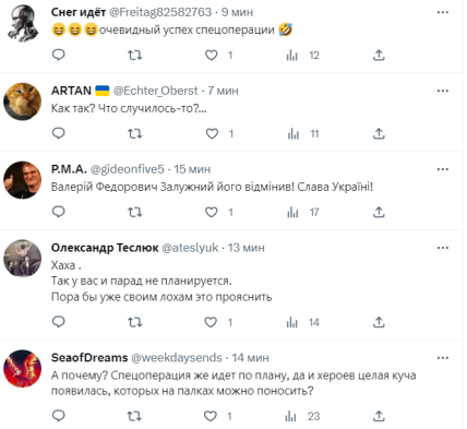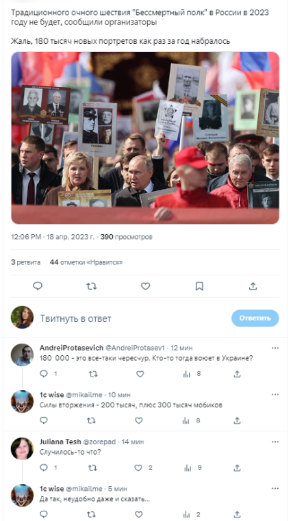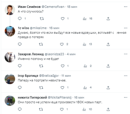 Советник министра внутренних дел Украины Антон Геращенко в своем Telegram-канале прокомментировал отмену шествия. По его мнению, это логичный ход, учитывая "успехи" российских военных на фронте, количество похоронок и разбитой техники.