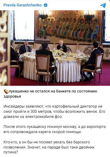 Он пишет, что по данным инсайдеров, лукашенко было настолько нехорошо, что он был не в состоянии пройти и 300 метров, чтобы возложить венок. Его довезли на электромобиле ФСО.