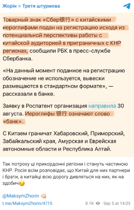 Российский Сбербанк регистрирует товарный знак с изображением своего логотипа, где слово "банк" будет обозначено китайскими иероглифами. Такую новинку страна-агрессор хочет ввести в приграничном с КНР регионе.
